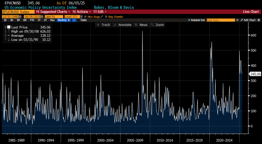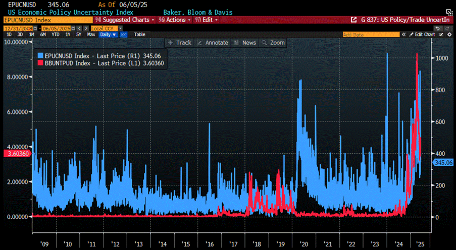 Since Inauguration Day, policy uncertainty—especially on trade—has spiked faster than a meme stock on Reddit. The US has recently hit levels above the chaos levels of Trump’s first term, with more turbulence ahead as new policies drop and global trade partners plot their revenge.