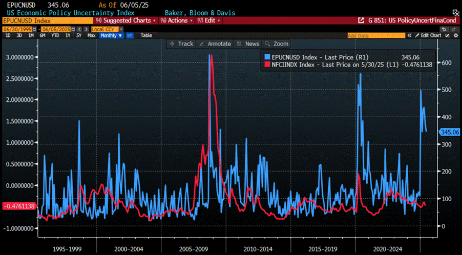 US Economic Policy Uncertainty Index (blue line); Chicago FED Financial Conditions Index (red line).