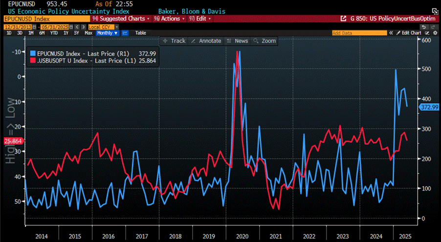US Economic Policy Uncertainty Index (blue line); US Business Optimism Index (axis inverted red line).