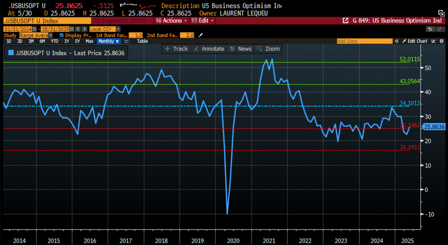 Indeed, policy chaos and looming tariffs are already souring the mood. The US Business Optimism index, a mix of 8 surveys from US ISM Manufacturing and Services sectors and regional FED business survey tanked below 1 standard deviation below the 10-year mean in March. And that was before the “reciprocal” tariff bombshell even dropped. Confidence, it seems, packed up early.