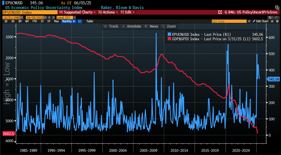 US Economic Policy Uncertainty Index (blue line); US GDP Private Domestic Investment Index (axis inverted; red line).