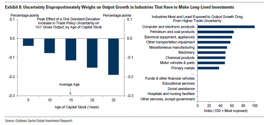 Elevated uncertainty tends to freeze decision-making—firms and households alike delay big, irreversible investments. Academic research back this up: when policy signals get murky, capital spending pulls back. During the last trade war, policy uncertainty chipped away albeit modestly.