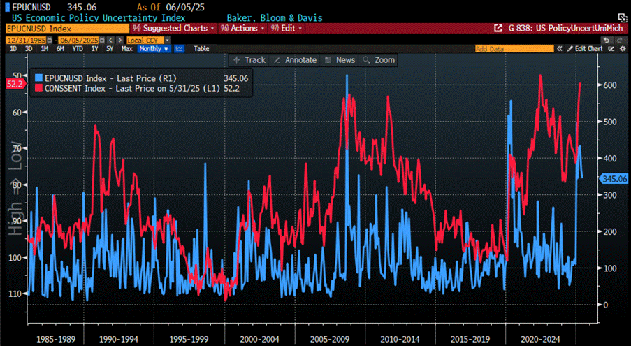 US Economic Policy Uncertainty Index (blue line); University of Michigan Consumer Sentiment Index (axis inverted; red line).