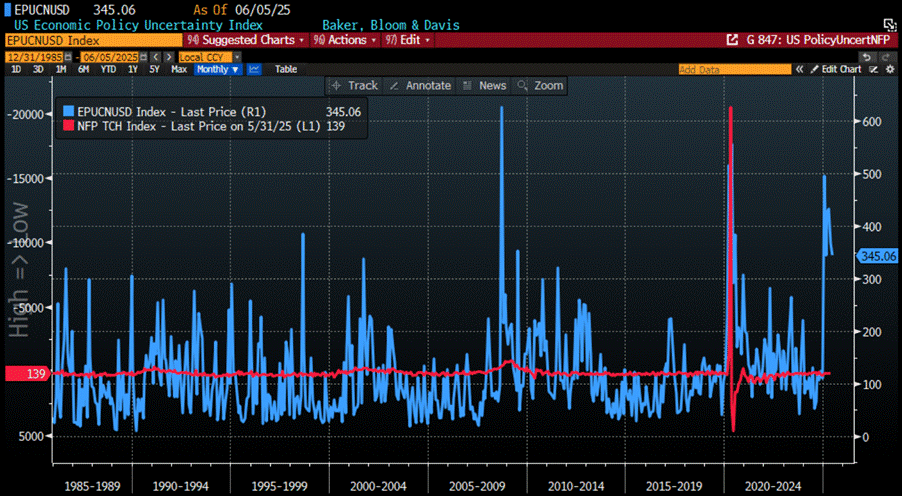US Economic Policy Uncertainty Index (blue line); US Change in Non-Farm Payrolls (axis inverted; red line).