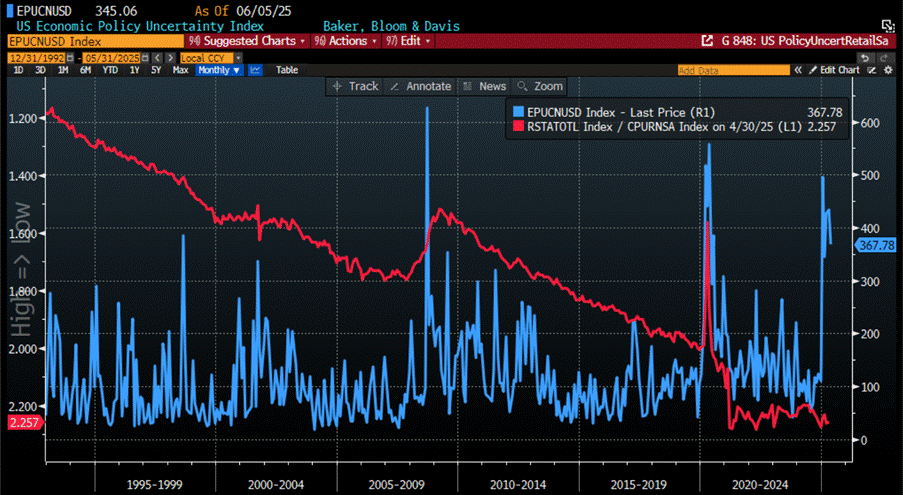 US Economic Policy Uncertainty Index (blue line); US Retail Sales Index adjusted to US CPI Index (axis inverted; red line).