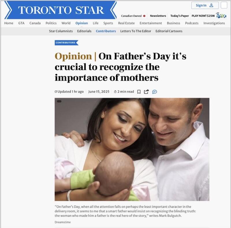 Canadian MSM never lets up: on the one day of the year you might think “hey, it’s OK to be male”, Canada’s Toronto Star chimes in with a borderline misandrist screed by way of an “opinion” piece by Mark Bulgutch (a former CBC executive producer) – who lectures us that men, fathers, in particular are “the least important character in the delivery room” and the real heroes of the day, are the mothers.