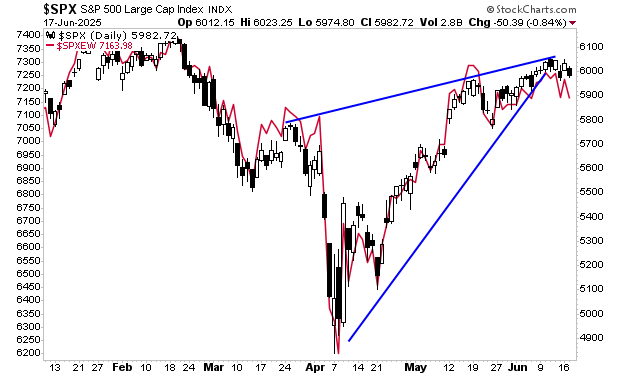 The perceived weakness in selling pressure is primarily due to the resilience of big tech, which has held up well this week. When you overlay the equal-weighted S&P 500 on top, the breakdown looks more serious.