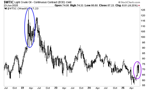 Another “tell” concerning this conflict was the fact that oil never really exploded higher beyond the initial attack. Compare what oil did in the last two weeks (purple oval in the chart below) to what it did when Russia invaded Ukraine (blue oval in the chart below) and you’ll see what I mean. During this recent conflict between Israel and Iran, oil didn’t even clear $75 a barrel for more than a few days! Oil knew that this conflict wasn’t going to escalate into something regional or global in nature.