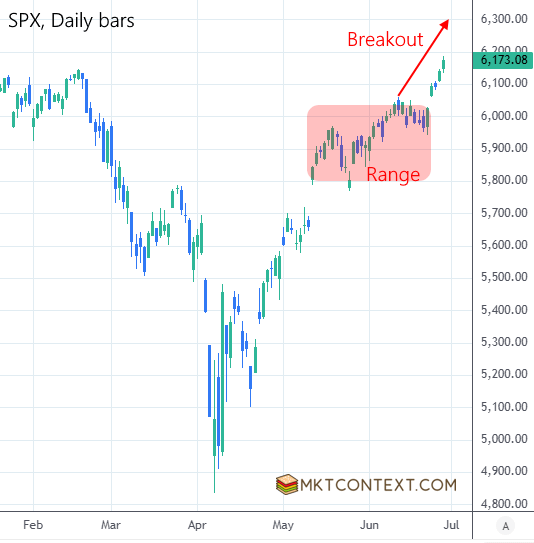 With the ceasefire between Iran and Israel announced, SPX broke decisively out of its 6-week trading range. A huge positive for the bulls as it means the rally can continue. The pullback that we were predicting was shallower than thought (we assumed it would retest the bottom of the range at $5800). That's just how strong it is.