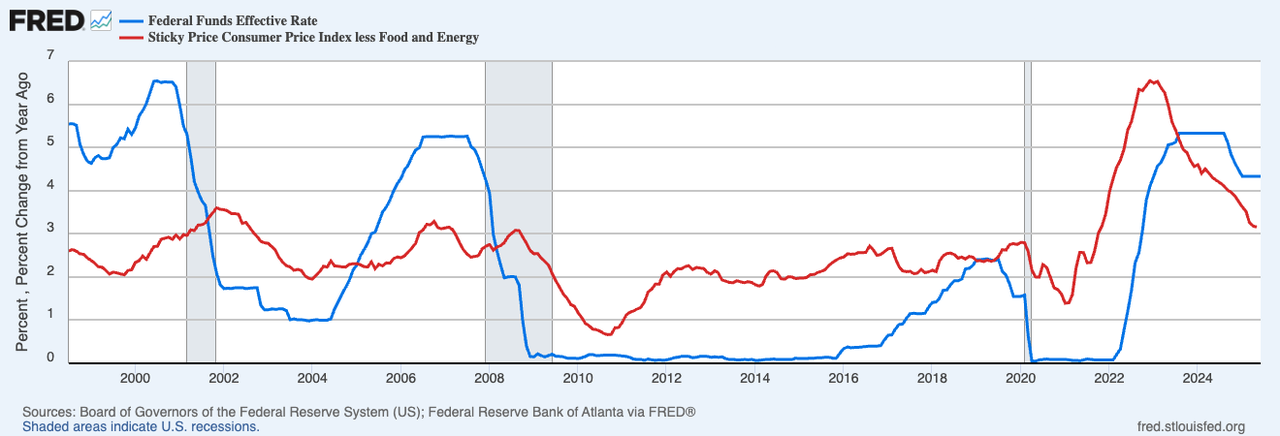 Depending on which inflation measure you use (CPI or PCE) inflation is either at 2.5% or 2.4%... but the Fed has rates at 4.5%. This is EXTREMELY restrictive monetary policy. Since 1998, any time the Fed has maintained real rates of positive 2% like this, something has broken in the financial system soon after.
