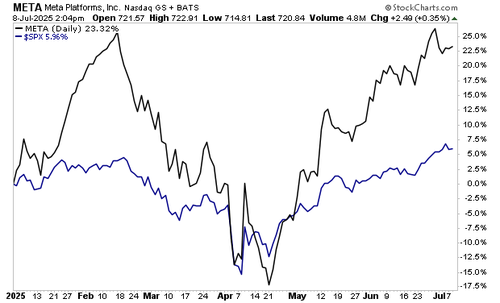 The market seems to be anticipating this… META is within spitting distance of its al-time highs. And the focus on AI is driving much of this price action. By way of contrast, AAPL, which has largely given up on the AI race is up only 5% (on par with the S&P 500).