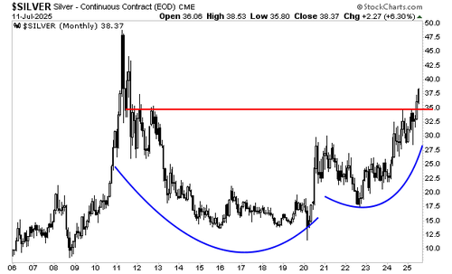 The precious metal recently broke out to new highs. Silver is breaking out of a massive ~15-year Cup and Handle pattern. The upside target for this move is north of $60 per ounce!