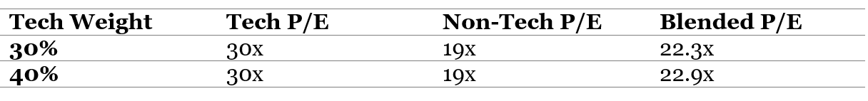Traditionalists argue the S&P 500’s current multiple of 22.3x forward earnings is too high. But they’re ignoring the shift in composition. High-growth tech companies often trade at 30–32x. If 30% of the index deserves a 30x multiple and the rest trades at 19x, the blended fair value is 22.3x. If tech’s share rises to 40%, the multiple jumps to 22.9x.