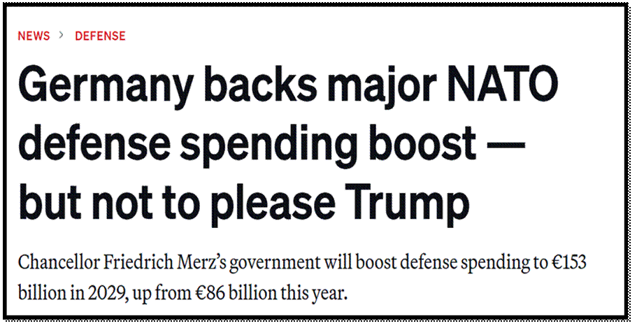 Germany pledged to meet NATO’s 2% GDP defence target, launching a EUR100 billion Bundeswehr fund —borrowed off the books. That fund’s nearly spent, but the demands keep mounting. Merz won’t suspend the debt brake outright; instead, he pushes shadow budgets and special funds to bypass it. The March 2025 deal carves out defence and security from debt limits and sets up a EUR500 billion infrastructure fund—EUR100 billion earmarked for green climate projects to drain resources and slow growth. States gain freer borrowing powers. In Brussels, Germany leads the hawkish charge against Russia, cloaked in “defence readiness” and “deterrence.” Merz openly threatens to supply NATO missiles to Zelensky, daring Putin to respond. When Putin called his bluff, Merz backpedalled—“just parts,” he claims, leaving Ukraine to assemble the weapons.
