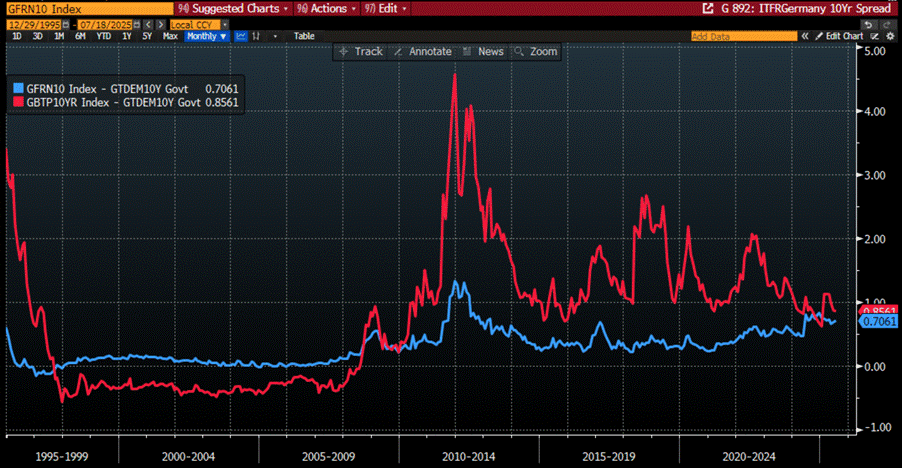 Spread between 10-Year French Government Bonds and 10-Year German Government Bonds (blue line); 10-Year Italy Government Bonds and 10-Year German Government Bonds (red line).