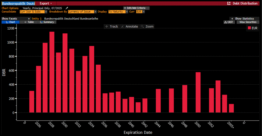 While all eyes are on Washington’s looming $7 trillion refinancing wall before the end of this Jubilee year, Germany’s situation appears—at first glance—more stable. The Bundesrepublik only needs to roll over around EUR30 billion by year-end. But don’t be fooled by the short-term optics. Looking further out, Germany faces a steep maturity cliff: EUR66 billion in 2026, EUR99 billion in 2027, and a staggering EUR115 billion in 2028. And that’s before factoring in the additional debt Berlin plans to issue to fund its newfound enthusiasm for militarization. So while the headlines may praise German prudence, the debt trajectory says otherwise. The “black zero” is dead, and the bill for abandoning fiscal discipline is only beginning to arrive.