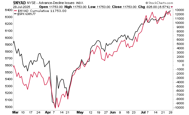 Secondly, market breadth, another metric that typically leads the overall index, has begun to roll over. Here again, this is a red flag that a pullback is coming shortly.