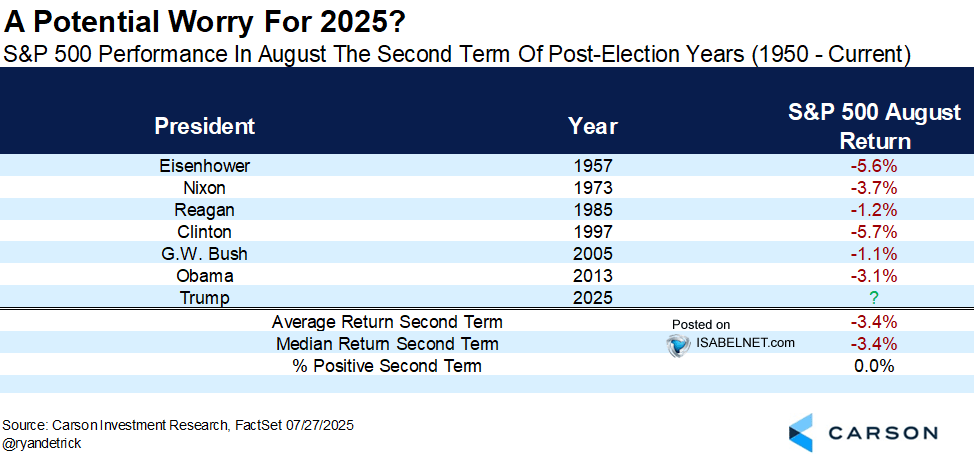 Finally, seasonals and historical trends are favoring a pullback. As Ryan Detrick notes, August is typically a weak month during the second term of a President. The average return is DOWN 3.4%.