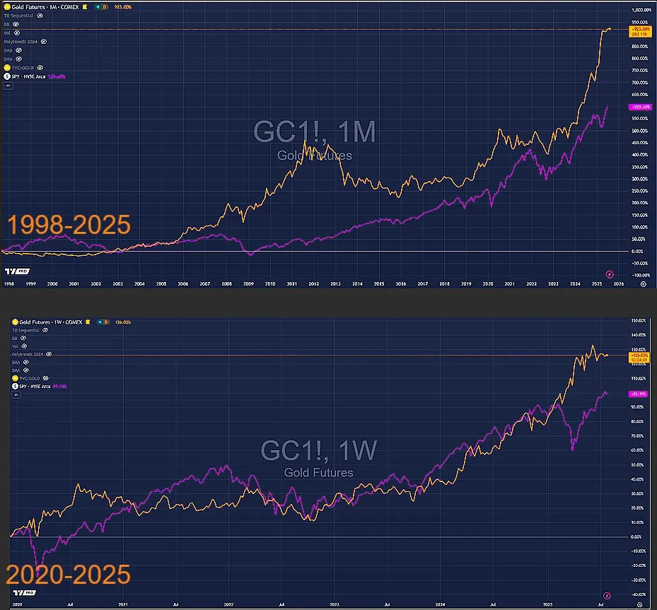 What emerges is a deeply uncomfortable truth. Gold has not only kept pace with equities; over longer timeframes, it has outperformed them. Since the post-crisis era, and again across a full 25-year window starting in 1999, gold (a so-called “pet rock”) has done as well, or better, than all the financialized ingenuity the equity markets have produced.