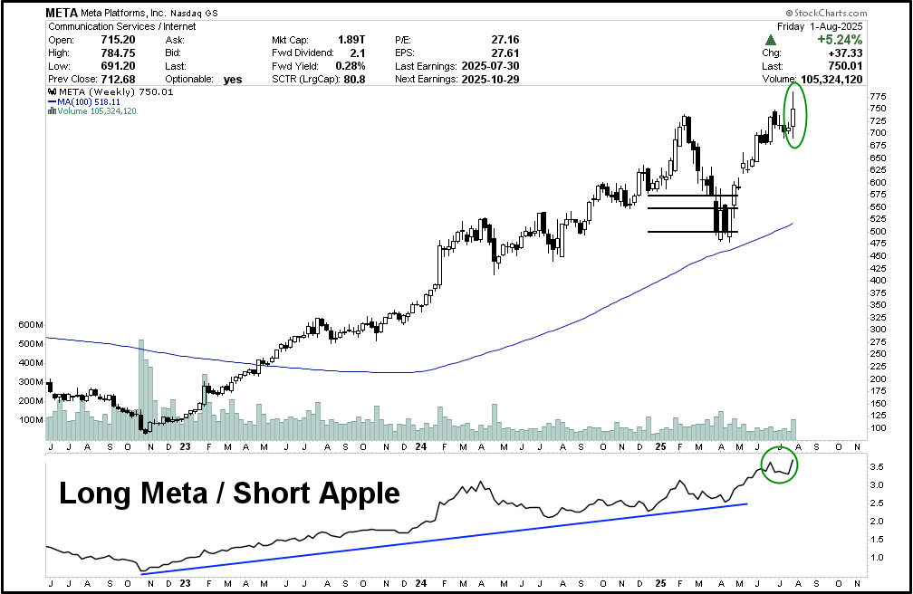 Meta is the strongest out there. Look at that engulfing candle. Our 3 year Meta/Apple pair trade really paid off.