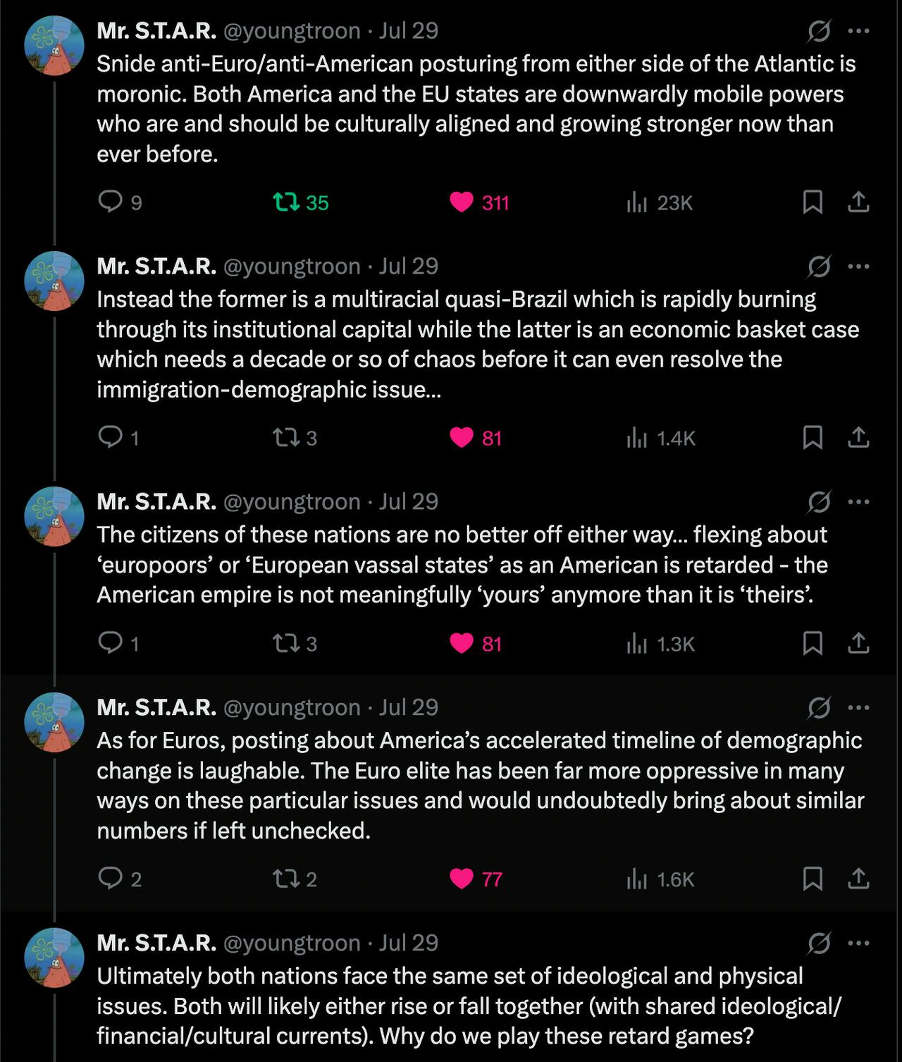 In general, the hostility fostered lately between American and European nationalists is counterproductive and self-defeating. I agree with this recent thread that actually both America and Europe are declining powers with very serious problems.