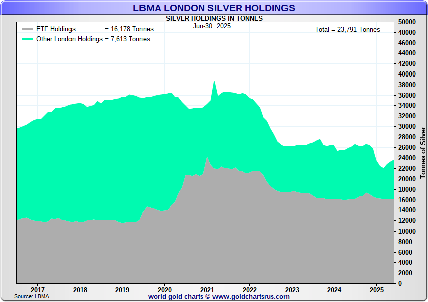 Here you can see that the LBMA holds a total of 23,791 tonnes of silver, although 16,178 of those tonnes are already accounted for by the ETFs.