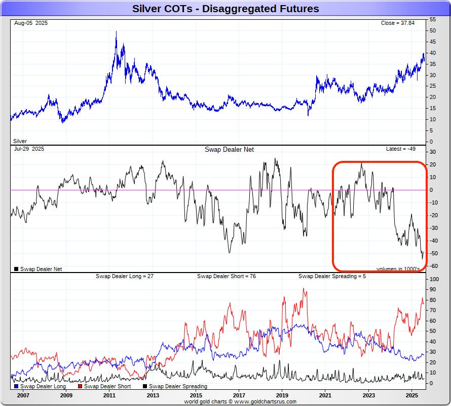 As you might imagine, given the current price levels, the short position held by the banks in both the gold and silver markets remains near the extreme end.