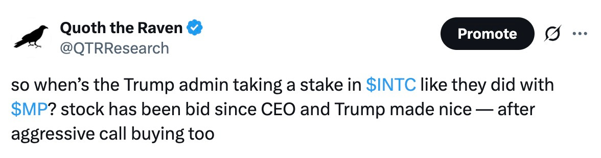 Intel shares were down more than 4% in early trading. But, if you see this as a step to Trump trying to position Intel as the flagship U.S. chipmaker — as I wrote would be bullish for them — this isn’t necessarily terrifying news. What comes of it remains to be seen, but cooler heads have a way of prevailing in these situations and it shows that Intel is a priority for the Trump administration. I added some shares this morning.