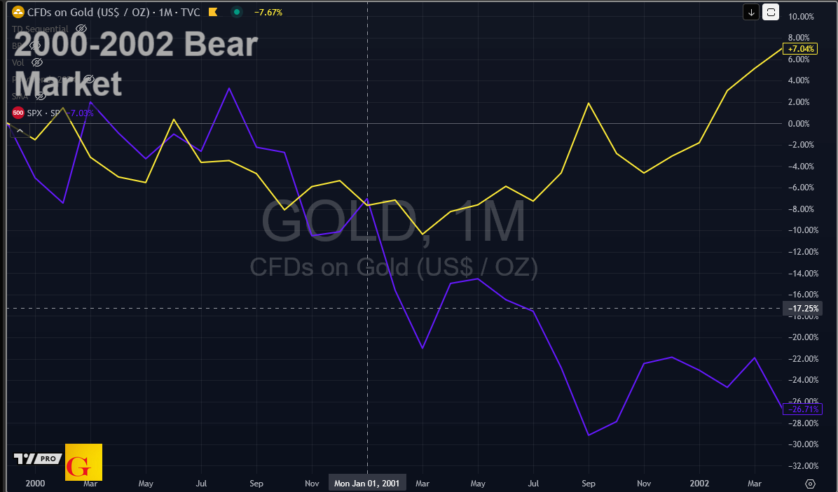 Similarly, during the 2000–2002 equity bear market, gold trended upward while the S&P 500 entered an extended decline.