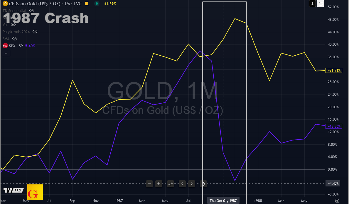 During the October 1987 crash, the S&P 500 lost over 34% from peak to trough, whereas gold rose by roughly 8.5% from its October low to its subsequent peak.