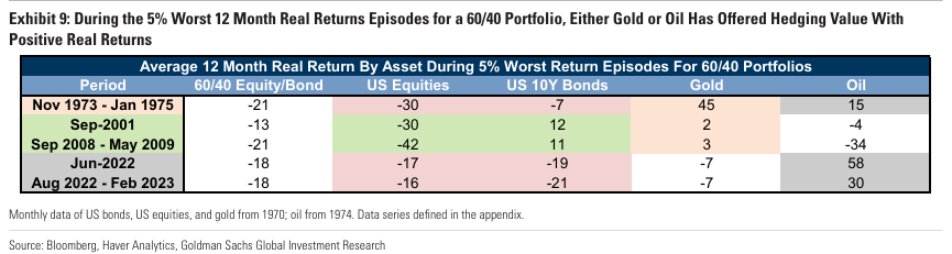 Two days ago we read a historical data piece by Michael Oliver on a recurring fallacy about gold in stock selloffs: “Gold does not hedge against stock loss.” Hard to believe this disproven canard still persists, but it does. We’ve broken it down with original charts below. For good measure, we’ve also included excerpted graphics from a recent Goldman report, Buy Gold Not Bonds, which calls for ending the 60/40 portfolio and replacing bonds with gold as a stock hedge. Enjoy your weekends.