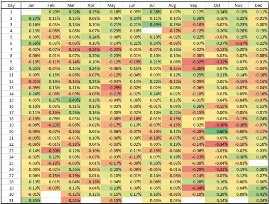 Because the index has been around for so long, we have a treasure trove of data. One of my favorite charts—courtesy of Goldman Sachs—breaks down the S&P 500’s average return for every day of the month going back to 1928. Green squares mark strong days, red squares mark weak ones. And September? It’s littered with red.