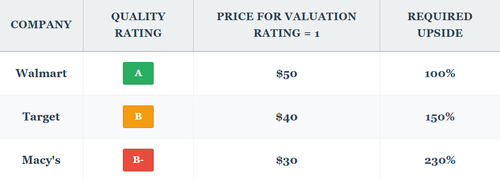 Our quality rating system becomes incredibly powerful once it’s married with valuation analysis. We spend hundreds of hours researching stocks to arrive at these two inputs (quality and fair value). Here’s how combining these ratings works in practice using a grossly simplified example (I use significantly oversimplified numbers here, but they are directionally similar to what we do in your portfolios).