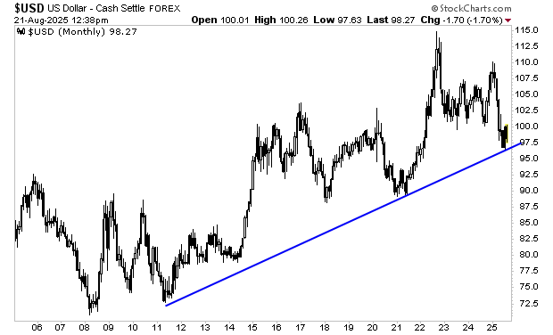 This is especially true as the $USD is on the verge of a MAJOR breakdown. I’ve shown this chart before. There’s a reason I’m showing it again: this is the SINGLE most important chart in our financial system today. When the $USD takes out that trendline, it will enter a secular bear market. And this will ignite an inflationary storm.
