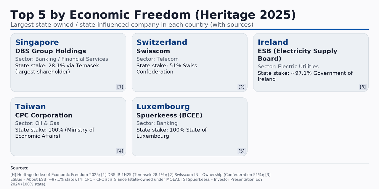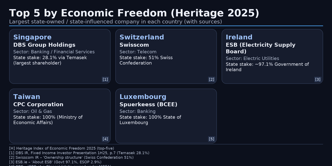 And the “freest” economies? They use the state, too. Heritage’s 2025 top five on economic freedom are Singapore, Switzerland, Ireland, Taiwan, and Luxembourg. All five have large, state-owned or state-influenced champions: