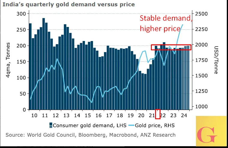 “Since 2022, India's gold demand has not appreciably fluctuated with gold price, whereas before 2022, it fluctuated frequently and usually in line with gold price changes. This change signals inelastic demand at a higher price replacing elastic demand at different prices.” India’s Demand Turns Inelastic Goldman Sachs confirms that thesis.
