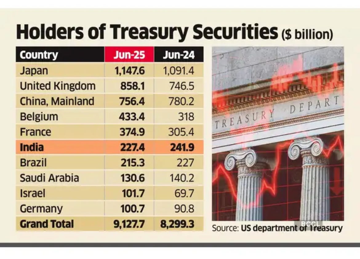 In retrospect, it’s obvious now that they were spending dollars to buy gold and now are in a better more flexible position enabling them to sell treasuries. According to the Economic Times (Sangita Mehta, Sept. 1, 2025), the latest data from the U.S. Department of Treasury and the Reserve Bank of India (RBI) show India’s investments in U.S. T-bills dropped to $227 billion in June 2025, compared with $242 billion a year earlier. At the same time, gold reserves rose to 879.98 metric tonnes from 840.76 tonnes, with RBI purchasing about 39.22 tonnes over the period.
