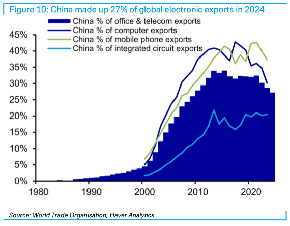 China’s role is estimated by subtracting bar, coin, jewellery, ETF, industrial, and reported official purchases from imports and domestic production. Industrial demand is approximated through China’s share of electronics exports, which account for 83 percent of global industrial gold use. In 2024, China controlled 27 percent of office and telecom exports, consistent with its 28 percent share of global manufacturing value added (Figure 10).