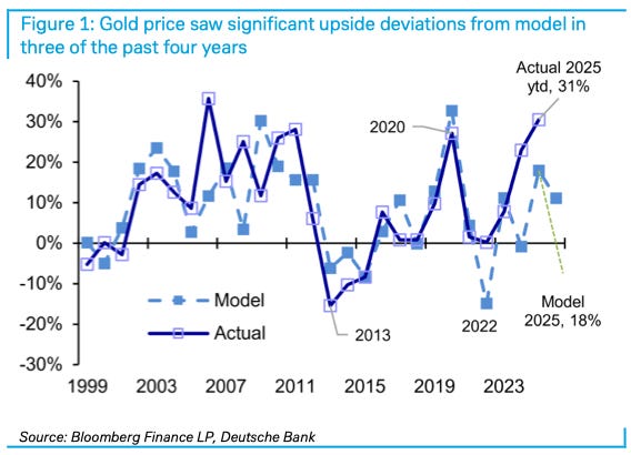 This week’s Deutsche Bank report by Michael Hsueh (h/t ZH) highlights the rising role of official gold demand in driving market performance. Gold has outperformed financial models (which are now useless in the wake of real physical demand) in three of the past four years, and the analysis attributes this to a structural increase in demand from central banks and sovereign wealth funds.