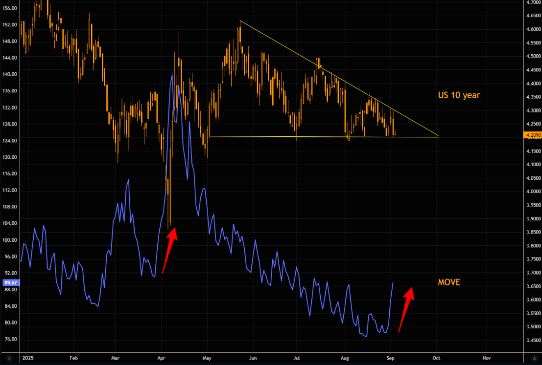 Why now? Pick your catalysts: heavy Treasury supply, sticky inflation prints, BOJ/yen wobble, oil popping, QT liquidity drain, term-premium creep. The 10-year can look “quiet” right before dealers/CTAs re-hedge and mortgage convexity kicks up vol.