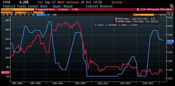 The Financials sector, meanwhile, seems allergic to rate cuts. Historically, it underperforms the S&P 500 — sometimes even ducking for cover before the Fed has swung its scissors. Banks and brokers remain the canaries in the interest rate coal mine.