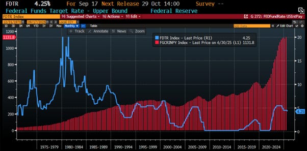 The White House keeps nudging the Fed to cut rates, even though the current backdrop screams for higher ones if the inflation mandate still means anything. But here’s the kicker: the Fed has about as much influence on government spending as a traffic cop has on a stampede. Interest payments will keep ballooning regardless, because at the end of the day, even zero rates can’t save you if Uncle Sam insists on spending like a drunken sailor with a stolen credit card.