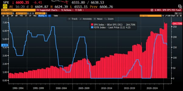 For corporate America, rate cuts are less a victory lap and more a distress signal. History shows they usually mean weaker, not stronger earnings — with EPS sinking until the Fed finally dusts off its courage and starts hiking again. In other words, profits don’t bottom when money gets cheaper, but when the ‘Central Banker In Chief’ starts playing tough guy.