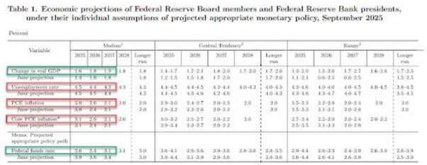 The 2025 dot plot was taken to the chopping block, with one member apparently slamming the “Cut!” button five times — presumably Stephen Miran, fresh off his appointment by Donald Copperfield to run monetary policy like a Vegas magic act, making money disappear for savers and reappear for debtors (including certain failed real estate-mogul-turned-politicians). Of the 19 Fed members, 7 see no more cuts this year, 9 see two, 2 see one, 6 see none (yes, the math makes sense somehow), and one brave soul even sees a hike. The Fed funds forecast for 2025 was trimmed from 3.9% to 3.6% — essentially just one more cut after the expected two this year. The dot plot still leans toward slower cuts near term, but the 2026 median moved lower and five members now think we’ll be under 3% by then. Toss in another trim for 2027 to 3.1%, and that’s 125 bps of cuts from September 2025 to the end of 2027 — far short of the 300 bps ‘The Manipulator In Chief’ turned Central Banker wanted, preferably “yesterday.”