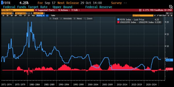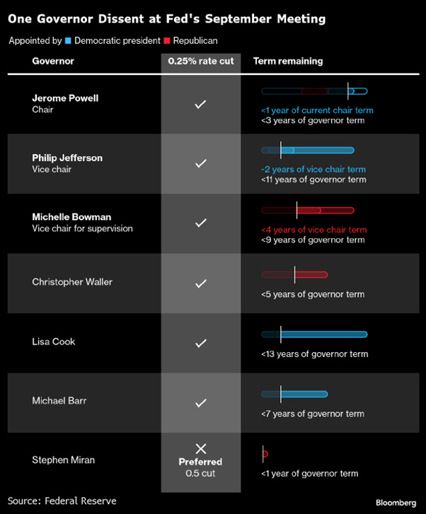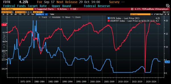 As widely expected, and fully priced — and just nine months after hitting the “pause” button — the Fed finally caved to political pressure and shaved its funds rate from 4.50% to 4.25%. It’s only the second-longest wait since the 1970s — the last time was back in 2001–2002, when markets were in the gutter, consumers were broke, and inflation was basically a no-show. This time? Not so much. The lone dissenter was Stephen Miran, fresh in the job and already gunning for a bigger 50 bps cut — talk about making an entrance.