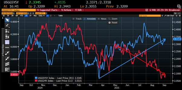 US 5y5y inflation swaps have been creeping up since Liberation Day in April, while 2-year Treasury yields have been tumbling since mid-May. The Fed’s political drama isn’t helping short-term yields took a nosedive after Adriana Kugler quit on August 1, and again when Donald Copperfield announced Lisa Cook was out on August 21. Meanwhile, long-term real yields stayed stubbornly high, creating what looks on the chart like an alligator’s jaw snapping shut. Wall Street, meet your new favourite creature feature.
