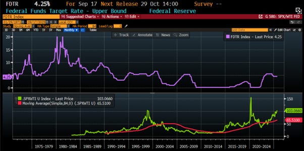 To grant the grand illusion of Donald Copperfield, Wall Street still treats the Fed like a wizard with a shiny lever labelled “soft landing.” But reality, rude as ever, keeps barging in uninvited. Take a peek at the Fed Funds rate and the S&P 500-to-oil ratio — every rate cut is basically the Fed hollering, “Dinner’s ready!” to the bust cycle. That ratio soars like a helium balloon, then nosedives like a kamikaze seagull straight through its 7-year moving average.
