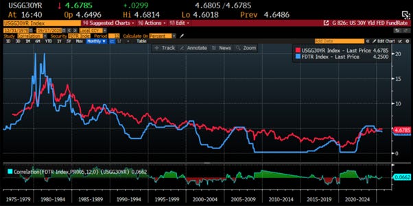 US FED Fund Rate (blue line); US 30-Year Yield (red line) & Correlation.