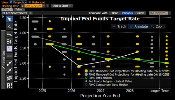 According to its SEP, the Fed now expects inflation to finally crawl back to 2%… in 2028. That’s seven straight years of overshooting the target — a perfect streak if you’re running a central bank comedy show. Still, that’s better than the nine years of chronic undershooting we endured from 2012 to 2020. GDP forecasts got a lift for 2025–2027, unemployment is unchanged for 2025 but slightly sunnier for 2026 and 2027, and PCE/Core PCE projections are mostly unchanged except for a nudge higher in 2026 — because why not keep everyone guessing?