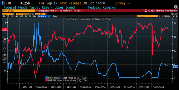 The sad reality is that, despite Wall Street’s bedtime stories and its army of fake-news fairy godmothers, anyone with half a brain — or at least the ability to read a chart without drooling — can see the trick. Every time in history the Fed starts snipping rates, the so-called “misery index” (a cocktail of unemployment and inflation) doesn’t go down… it shoots up. Translation: rate cuts are less a magic wand and more like Jerome Powell handing you an umbrella just as the hurricane makes landfall.